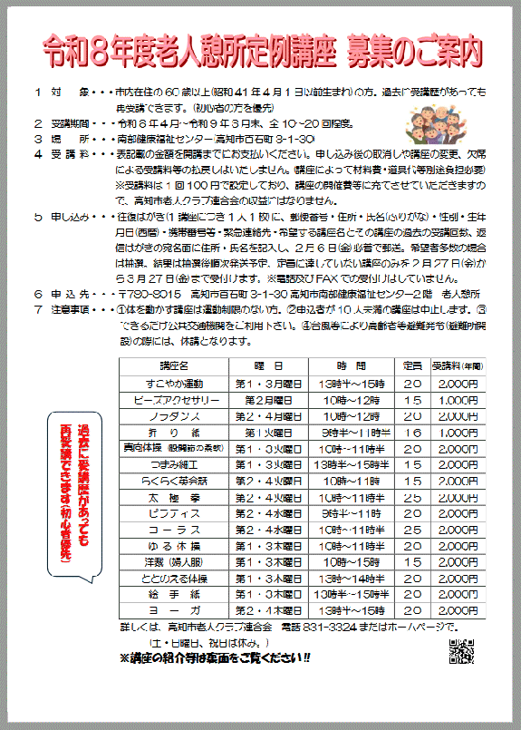②保健福祉センター、東部・西部・南部(老人憩所)の各健康福祉センター、あじさい会館で開講される同内容の講座への重複申し込みはできません。